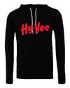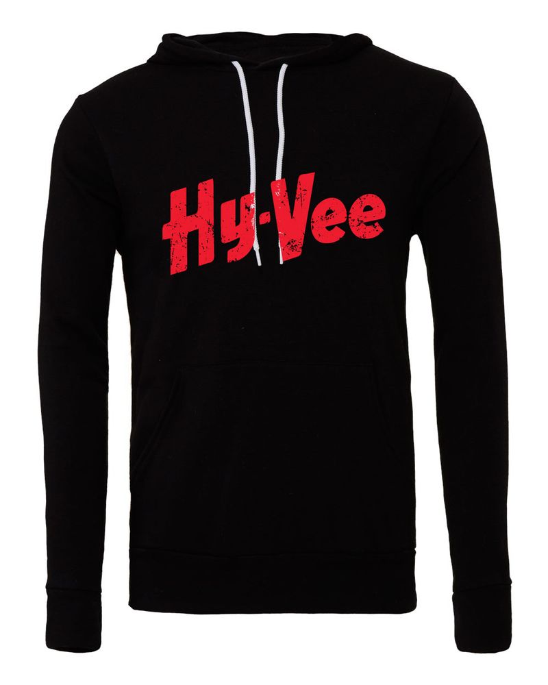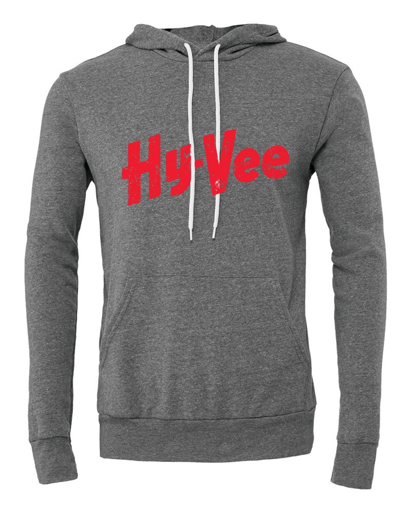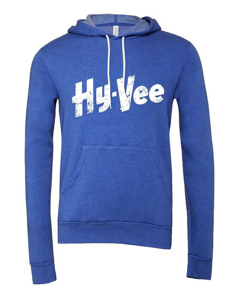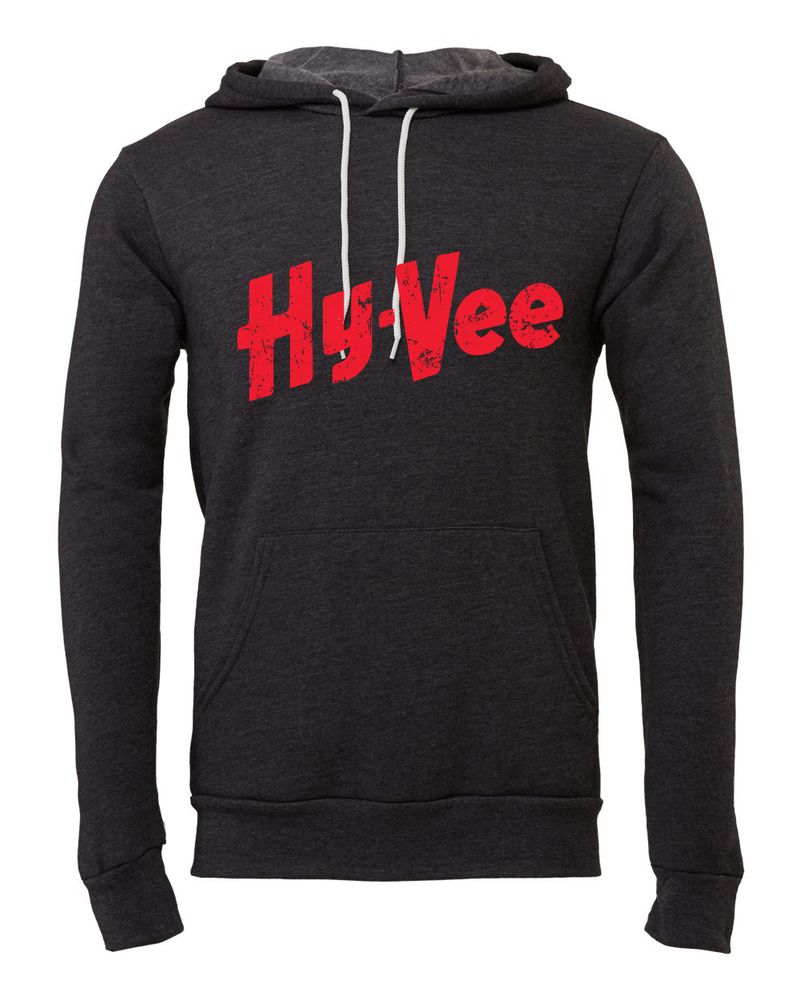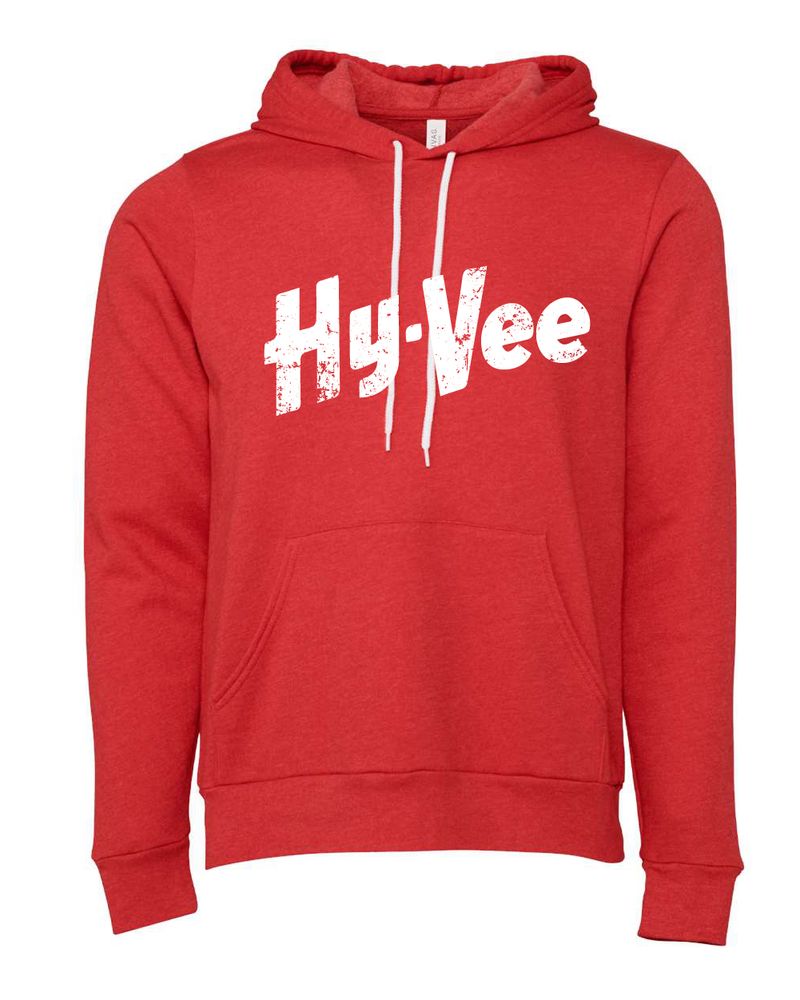 Vintage distressed Hy-Vee Logo Screen Printed Across Full Front; White Ink on Red and Royal, Red Ink on Dark Grey, Black and Deep Heather.